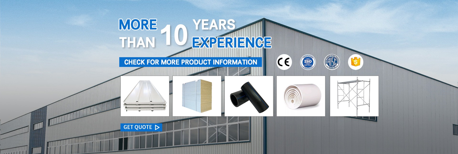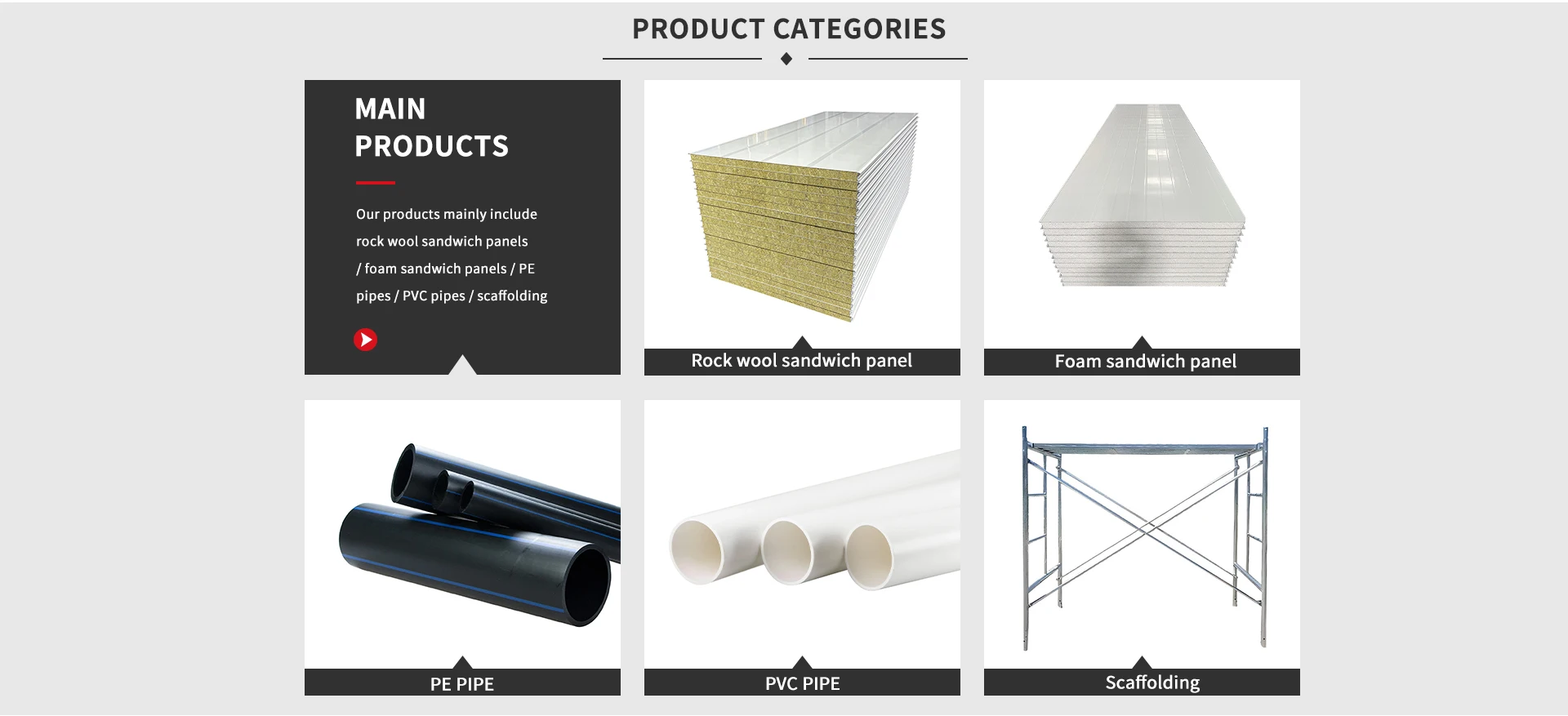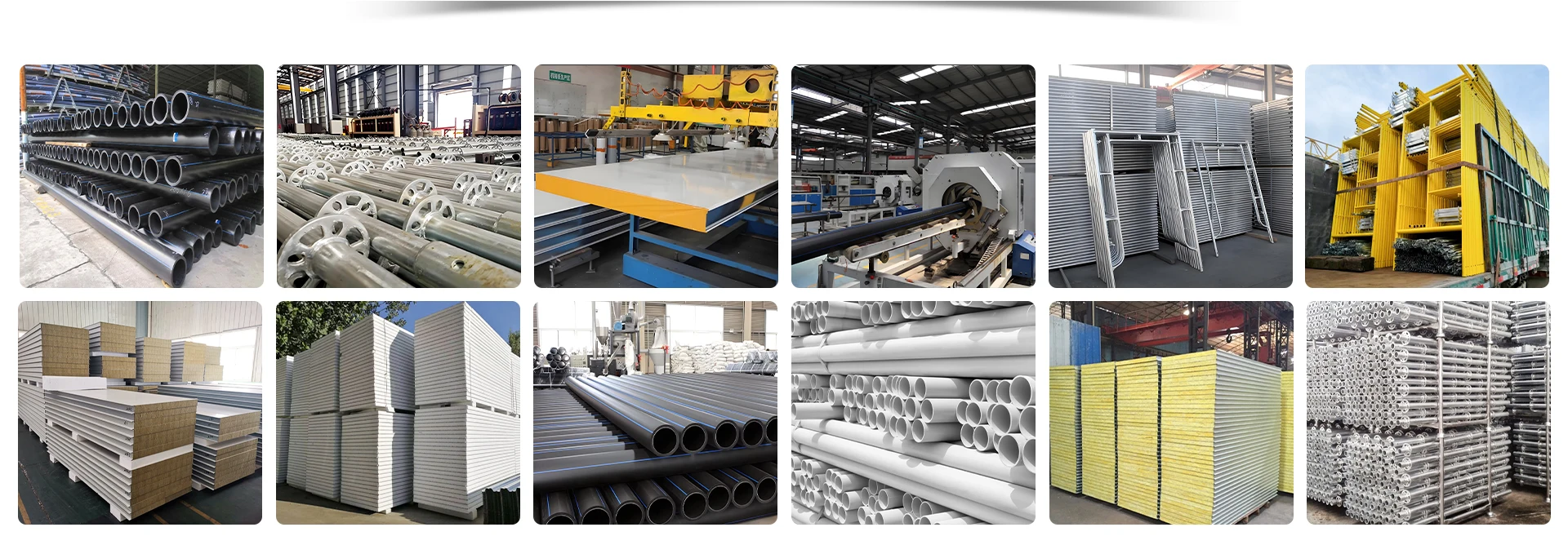 Productos principales:Andamio, tablero de lana de roca, tubería de PE, tubería de Mpp, tubería de PVC